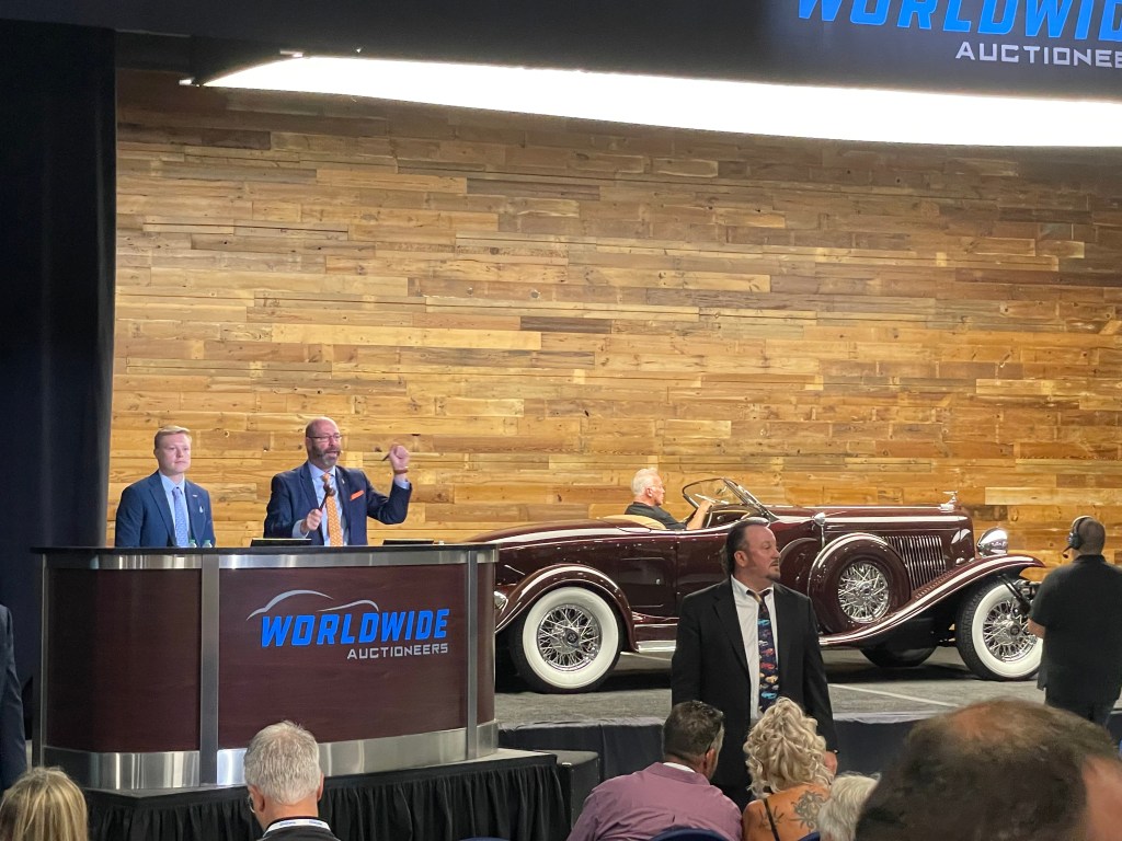 Above Photo: Bradey Gerke Color Commentator beside Chief Auctioneer Rod Egan on the auction block selling a 1932 Auburn 12-160A Boattail Speedster for $1,022,500 in 2024 at The 54th Annual Auburn Auction.